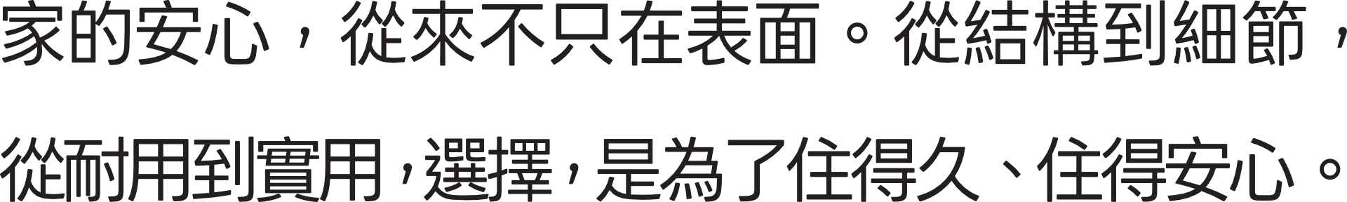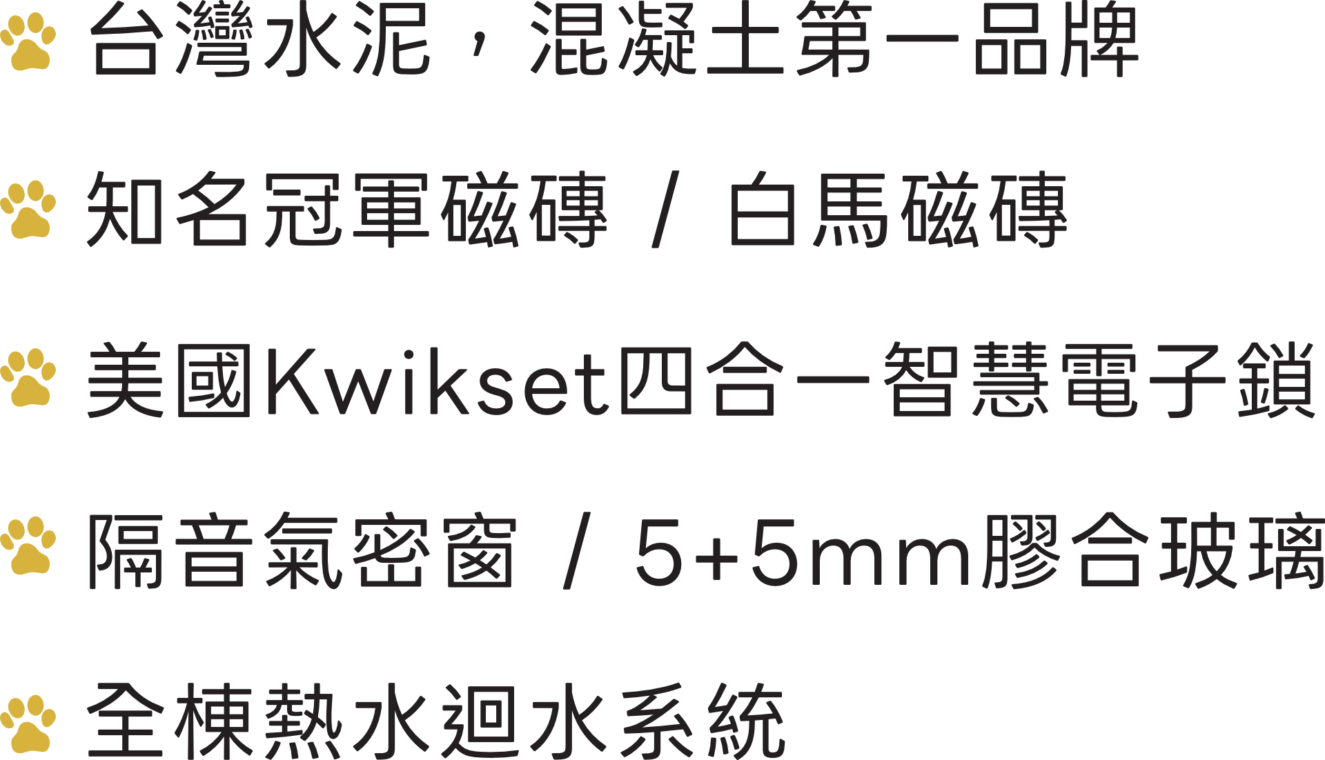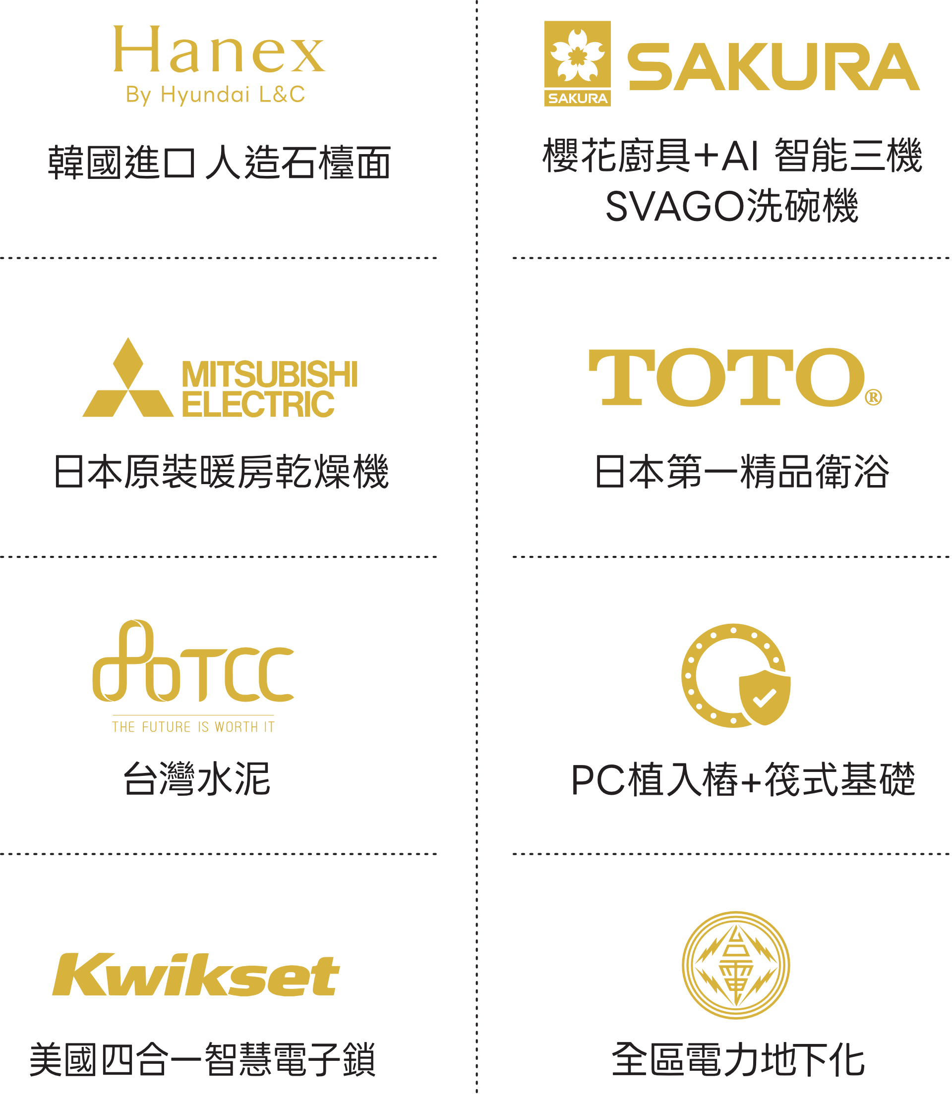 :基樁加筏式基礎、全區電纜地下化、日本原裝三菱暖房乾燥機、美國Kwikset四合一智慧電子鎖、台灣水泥(低碳水泥)、熱水迴水系統。